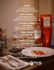 Indulge in a curated 6-course dinner paired with 6 premium whisky expressions, featuring Macallan and select single malts including Highland Park 12-Year, Macallan Harmony Collection “Jing”, Macallan Classic Cut 2025 Edition, Macallan “A Night on Earth – The First Light”, Macallan 15-Year Double Cask, and Glenrothes 15-Year.